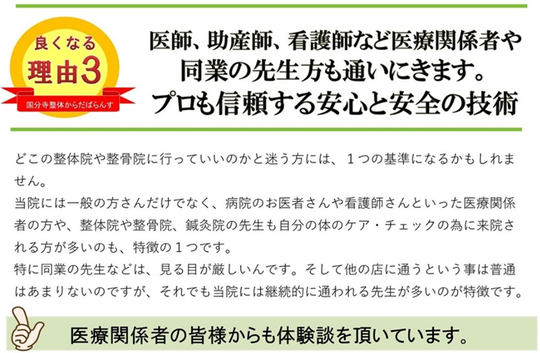 一つ一つ細かく症状を聞いてくれて、その日の症状にあった施術をしてくれたこと。そしてアドバイスを頂けるので良かったです。
