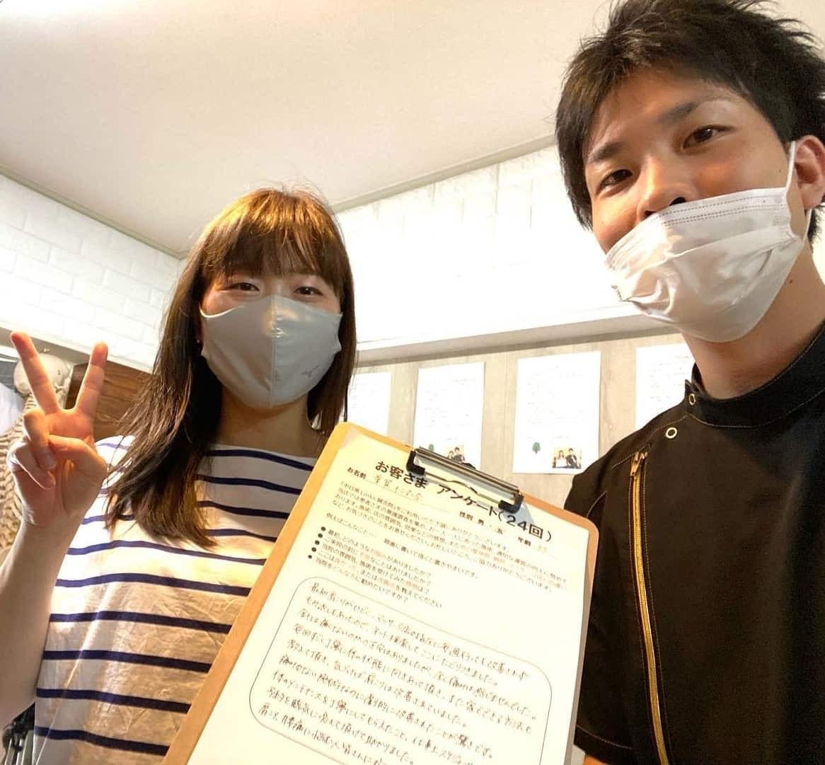 痛みのない施術なのに劇的に改善されたことが驚きです。体のメンテナンスを丁寧にしてもらえたこと、仕事上スケジュールが不確かな中予約を臨気に変えて頂いて助かりました。