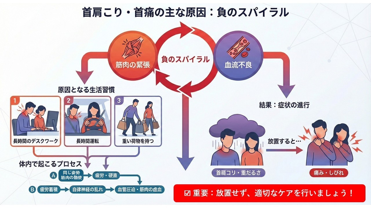 首肩こりや首痛の原因は多岐にわたりますが、特に多いとされる要因は「筋肉の緊張」と「血流不良」です。筋肉は長時間の使用や疲労によって硬くなり、同じ姿勢を長時間維持するデスクワークや運転などが続くと、筋肉の緊張が高まり血流が悪化します。また、疲労が蓄積すると自律神経が乱れ、血管が圧迫されることで筋肉が虚血状態になることもあります。