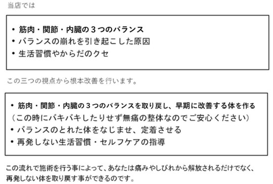 そのいずれも痛い場所ばかりを追って、全身のバランスに不可欠な「自律神経」に着目せずに体の歪みだけを原因にしているのが現状です。体の歪みのほとんどは「筋肉」「内臓」「循環」などをコントロールする、「自律神経の乱れ」からくるという事実を基に生み出された、独自の理論が当店の施術です。これを受ける事ができるところは全国でも数少ないのです。