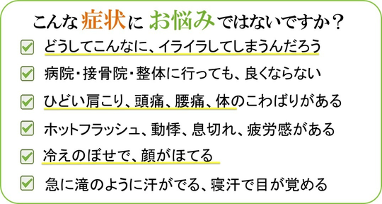 更年期の症状は全身に様々な症状で表れ、日によっても辛い日や軽い日があります。