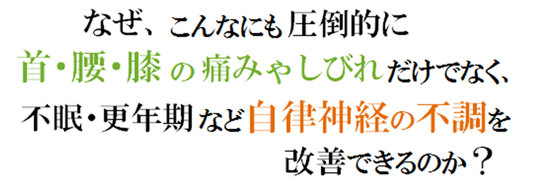 そのいずれも痛い場所ばかりを追って、全身のバランスに不可欠な「自律神経」に着目せずに体の歪みだけを原因にしているのが現状です。体の歪みのほとんどは「筋肉」「内臓」「循環」などをコントロールする、「自律神経の乱れ」からくるという事実を基に生み出された、独自の理論が当店の施術です。これを受ける事ができるところは全国でも数少ないのです。