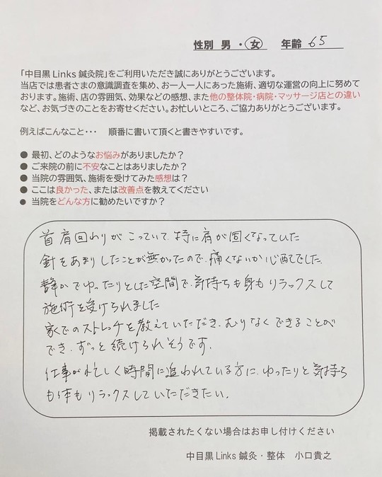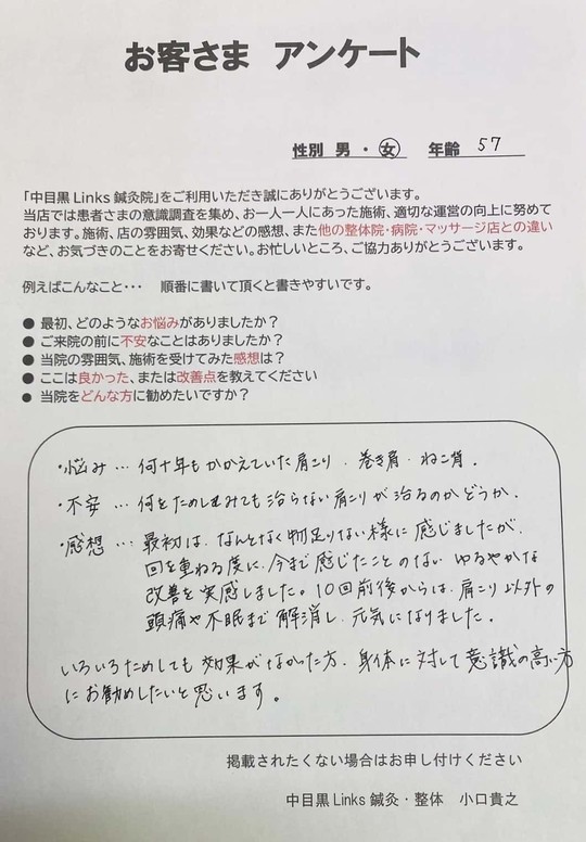 感想・・最初はなんとなく物足りない様に感じましたが、回を重ねる度に今まで感じたことのないゆるやかな改善を実感しました。10回前後からは肩こり以外の頭痛や不眠まで解消し元気になりました。