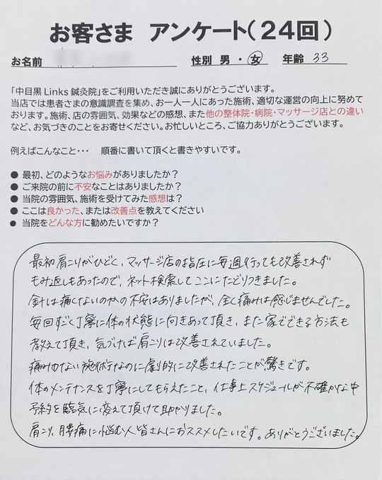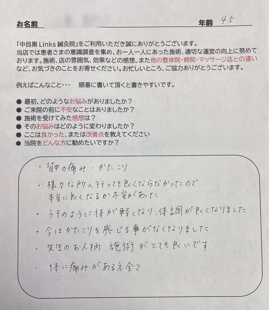 最初肩こりがひどく、マッサージ店や指圧に毎週行っても改善されず揉み返しもあったのでネット検索してリンクス整骨院にたどり着きました。