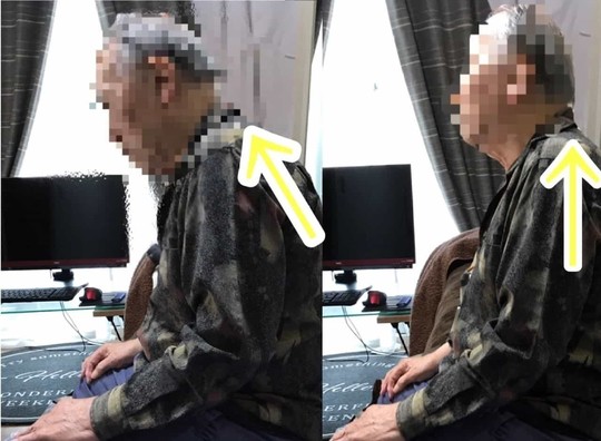首、背中、腰、膝の痛みがある高齢男性。姿勢を整えていくことで負担が徐々に軽減します。「もう歳だから・・」初めはこのような言葉が多く聞かれましたが、徐々に「もう少し頑張ってみるかな」と前向きな発言が目立つようになってきました。