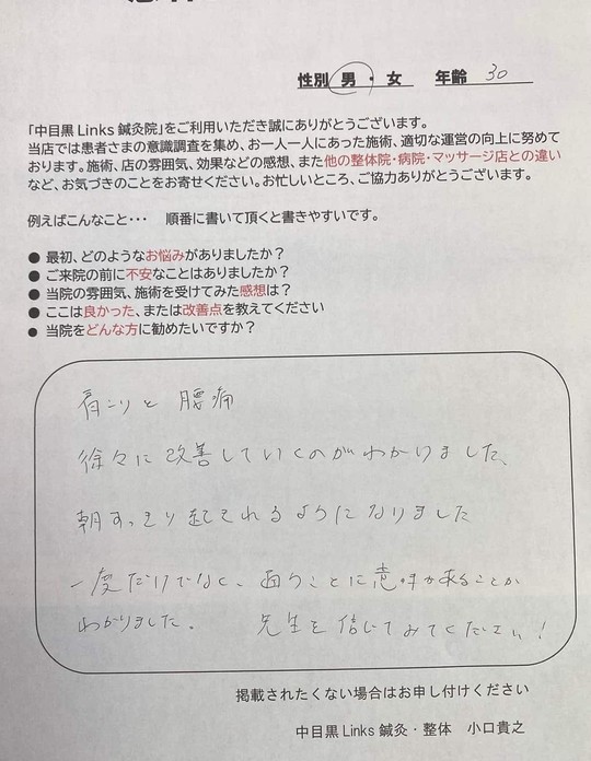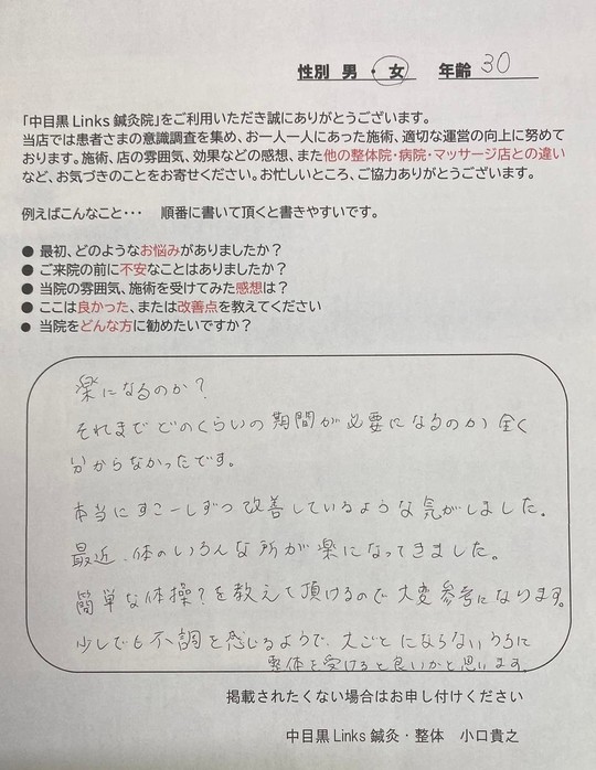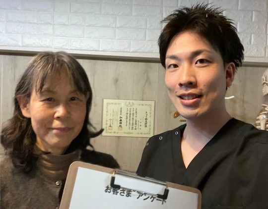 痛みのない施術なのに劇的に改善されたことが驚きです。体のメンテナンスを丁寧にしてもらえたこと、仕事上スケジュールが不確かな中予約を臨気に変えて頂いて助かりました。